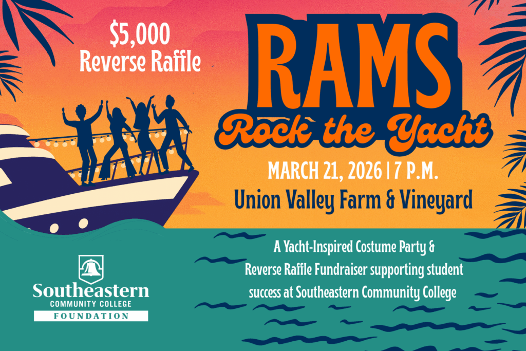Get ready to ride the waves at the Southeastern Community College Foundation’s “Rams Rock the Yacht” annual spring fundraiser. Benefiting the RamsFund, this event sets sail at 7 p.m. on March 21 at Union Valley Farm and Vineyard. SCC Foundation Executive Director Terrie Priest promises a casual evening of fun, dancing, food and yacht rock music.